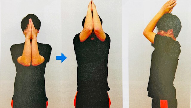 体幹の前で、両うでの肘を曲げた状態で、指から前腕を密着させます。そのまま両肘が離れないように肩関節を屈曲していく。肩の屈曲角度の大きさで広背筋の伸張性を評価できます。